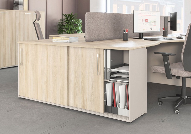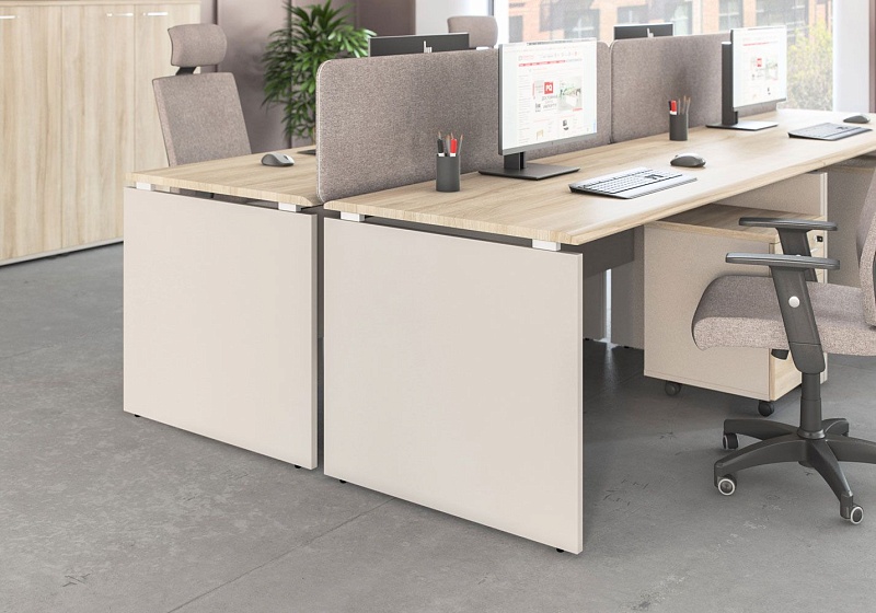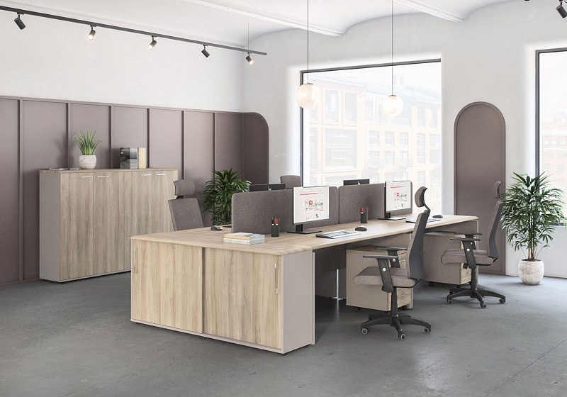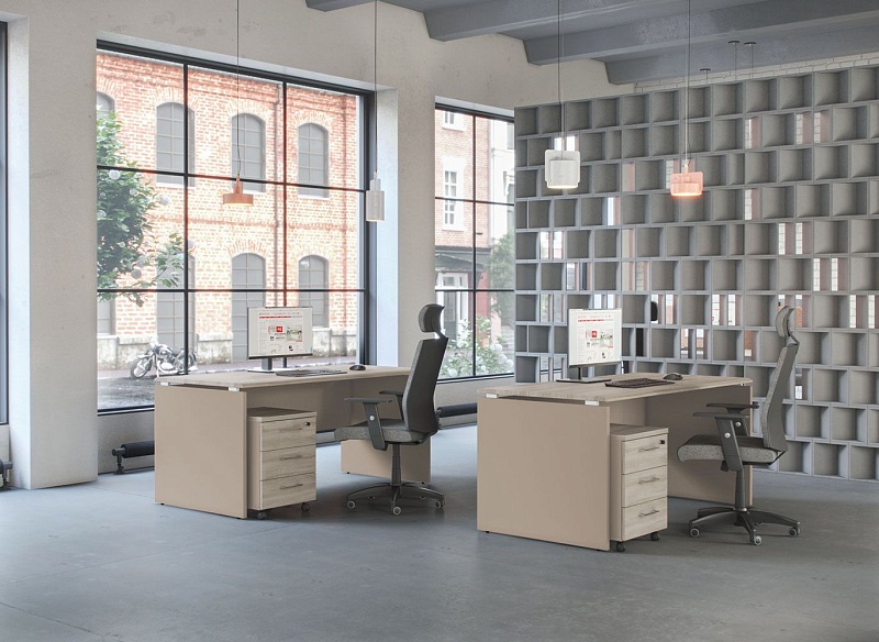 Особенности: возможность сочетать два цвета при заказе столов, шкафов, тумб. Столы с проставками, соединяющими опоры и столешницу, что придает  столешнице «парящий» эффект.