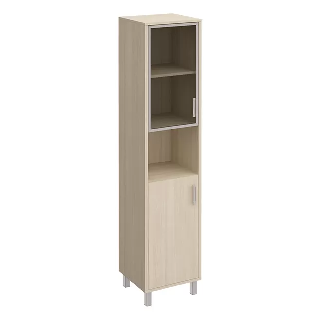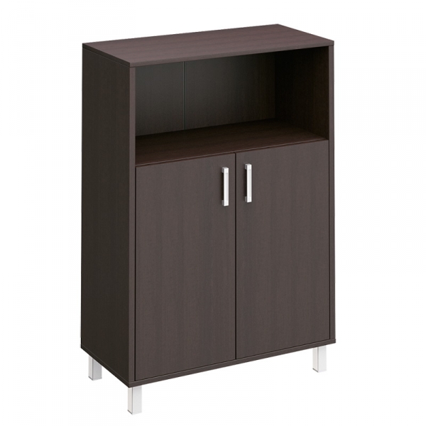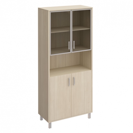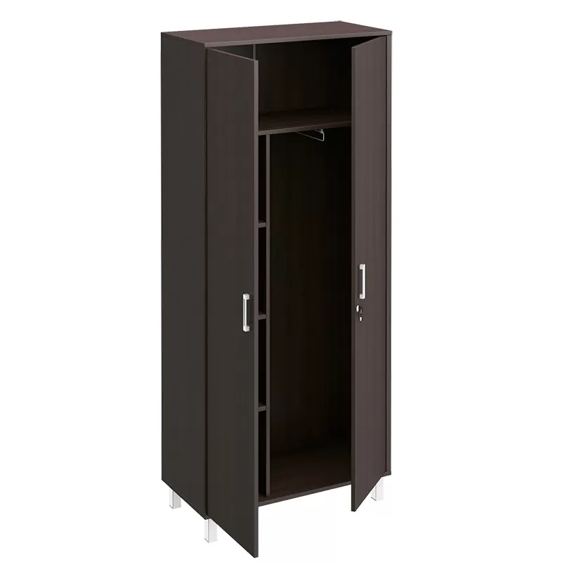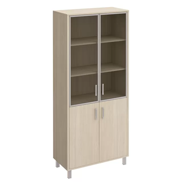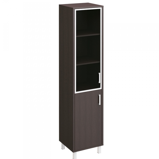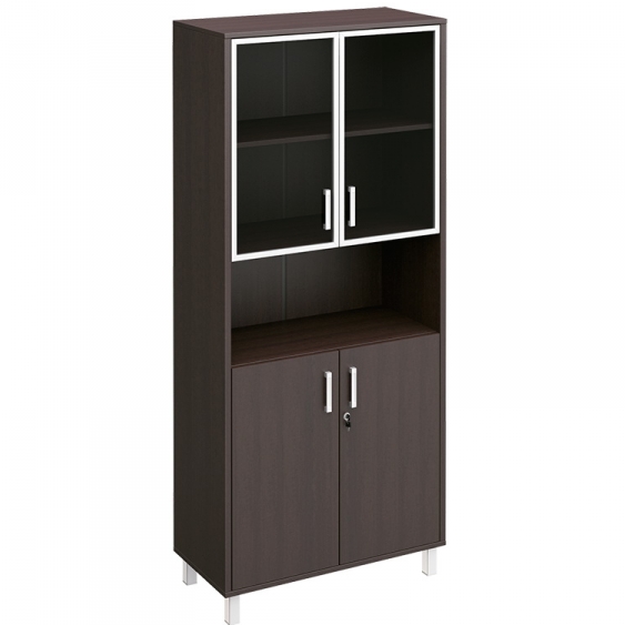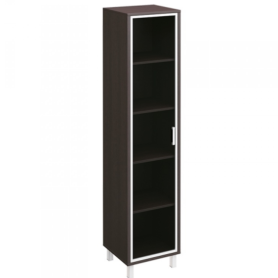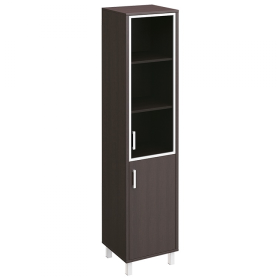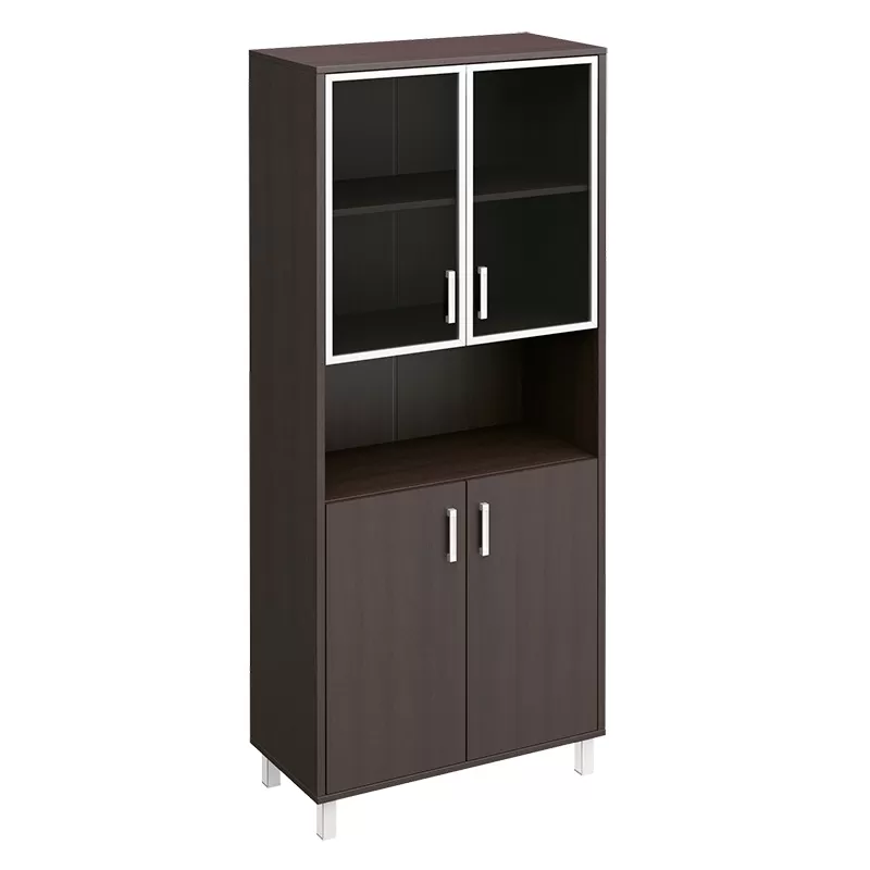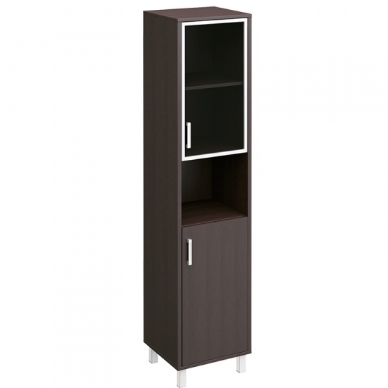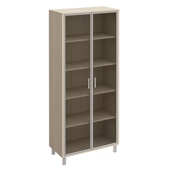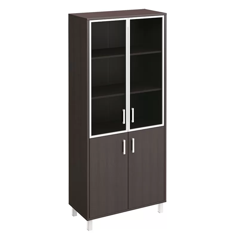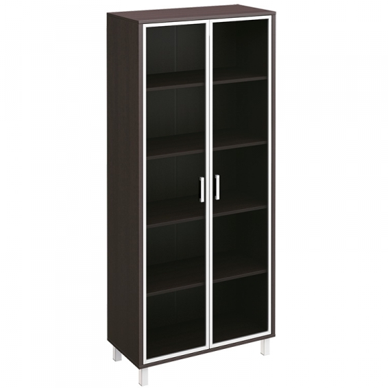 Особенности: металлические декоративные детали в столах, тонированные стеклянные двери шкафов и тумб в алюминиевой раме