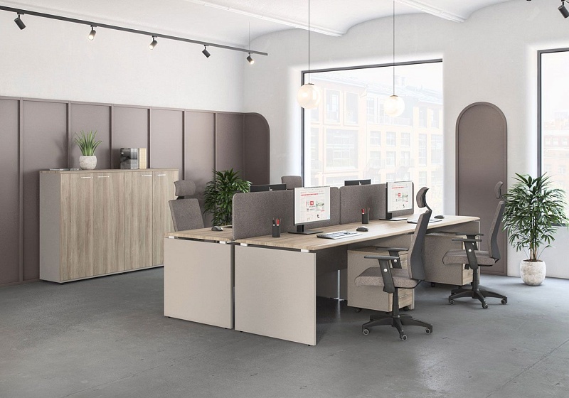 Особенности: возможность сочетать два цвета при заказе столов, шкафов, тумб. Столы с проставками, соединяющими опоры и столешницу, что придает  столешнице «парящий» эффект.